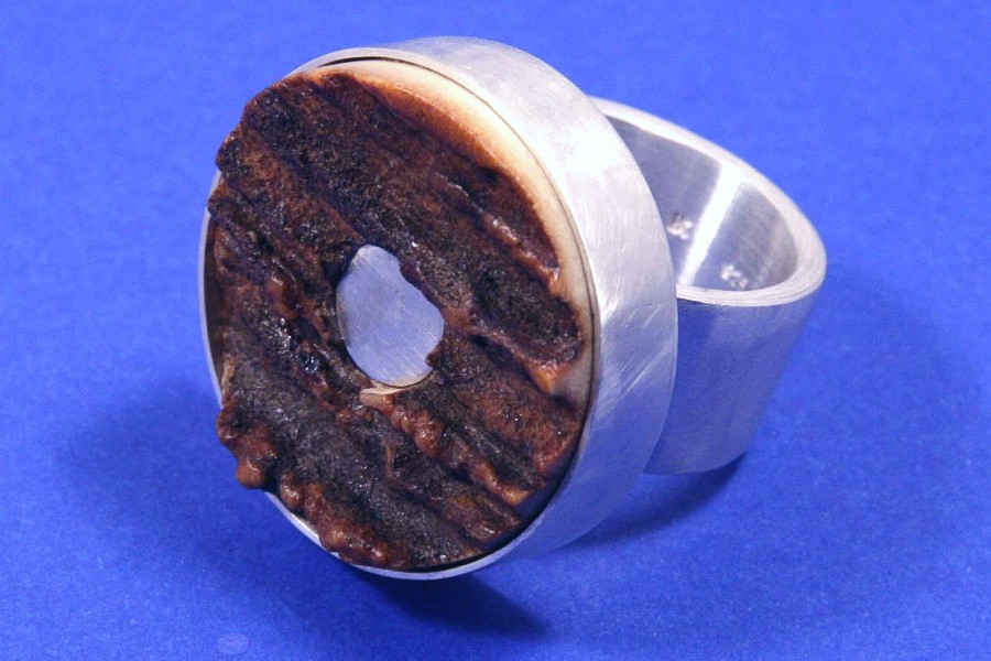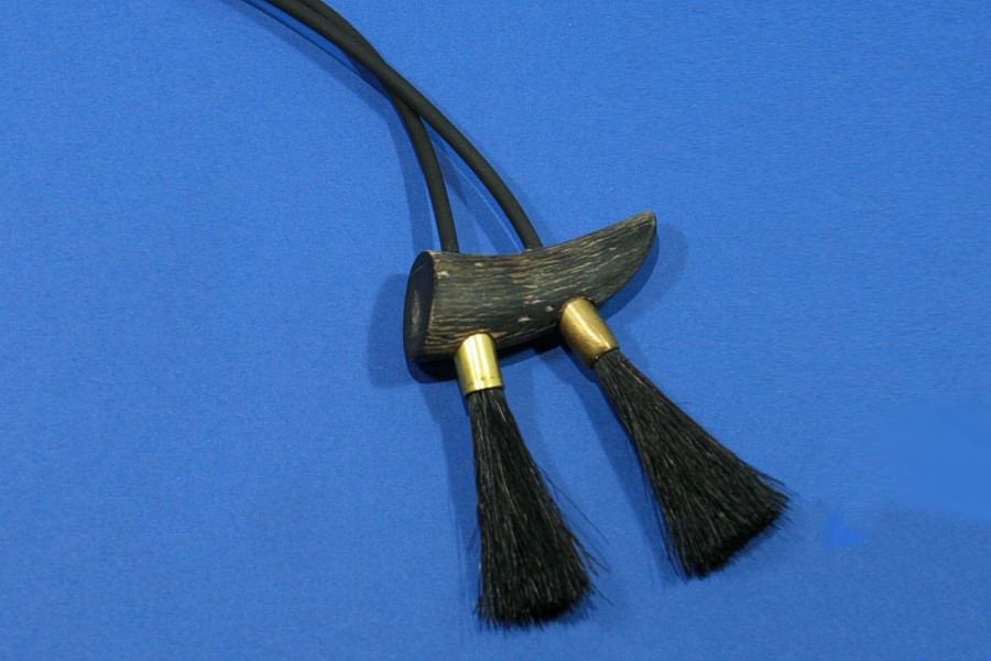 | Ohrhänger Silber / Buttons | Ring Silber / Hornknopf | Kette Horn / Pinselteile / Kautschuk | ||